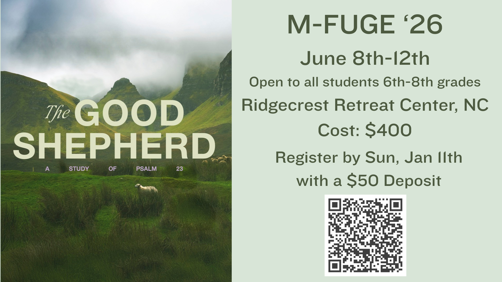 This trip is open to any student currently in 6th-8th grade. We will be going to M-FUGE at Ridgecrest Retreat Center in Ridgecrest, NC on June 8th-12th.